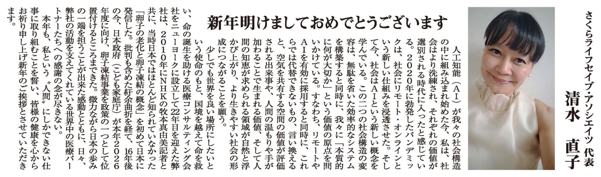 さくらグループ代表による2026年新年のご挨拶が、米国新聞「ニューヨークビズ」新年号に掲載されました。 さくらグループは、創設以来、日米をはじめとする国際的な視点から、家族形成を支援する活動を継続して…